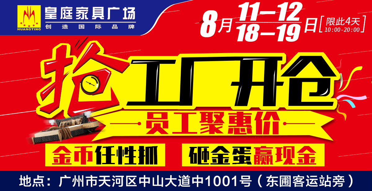 惠利无限!8月11-12/18-19日,皇庭家具广场举办【抢工厂开仓 员工聚惠价】的大型促销活动。钜惠四天,联合100多个工厂/商户/商场三方联合共同让利,抢工厂开仓价,全场明码实价!活动期间,消费满额即可砸金蛋,至多可中3000元现金!购物满额还可参与金币任性抓!还有家具大秒杀!福利多多,优惠多多!